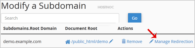 4. Click the "Manage Redirection" link that corresponds to the subdomain that you wish to manage.
