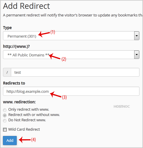 3. Under "Add Redirect" you should enter the following details and chose the appropriate option.