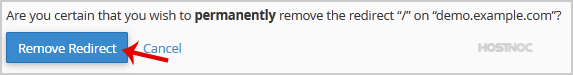3. Scroll down to the end of page and under "Current Redirects" locate the domain and click on the "remove" icon.