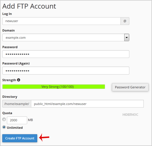 • Directory: If you want to give access to the entire /public_html folder, enter "public_html" or change folder path to a different path like "public_html/newuser" and your FTP user will be granted access to only the "newuser" folder. Your FTP user will also be unable to access folders outside of the "public_html/newuser" folder.
