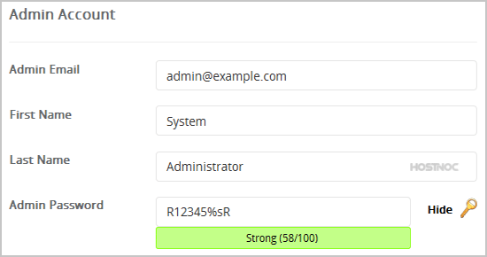 8. Under the "Admin Account" field enter the following information: