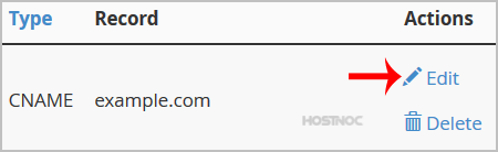 Locate CNAME Record you wish to edit or remove. Should you wish to edit a CNAME record, click the "Edit" option, modify the details and then click on "Save Record". Removing a record can be done with the "Delete" option.