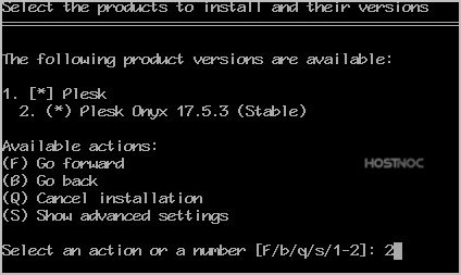 Step 2: Now you can select a version. For Plesk, type 1 and for Plesk Onyx, type 2. Then press enter. Type "F" and press enter again to go to the next option.