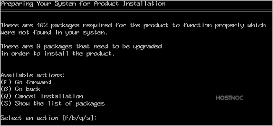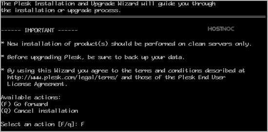 Step 4: Press "F" again. The installation will begin, which can take as long as 20 to 30 minutes. If it shows a hostname-related error, do not quit the installation. Sometimes Plesk only shows warnings and provides you with an instruction of how to fix your problem.